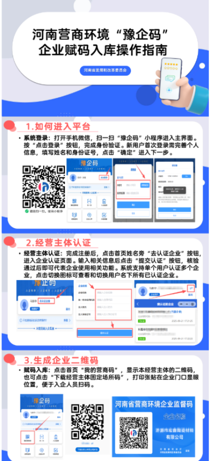 目前,全省经营主体赋码入库工作已启动。示范区内所有企业及个体工商户,均可通过微信扫描“豫企码”,或微信登录“扫码入企”小程序,完成注册后即可生成专属“企业码”。注册流程简单高效,全程线上办理。注册成功后经营主体可以通过省营商环境扫码入企监测管理平台,依法依规维护自身合法权益,监督规范执法行为,共同打造示范区一流营商环境,为示范区经济高质量发展注入新动能。